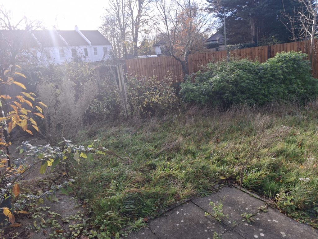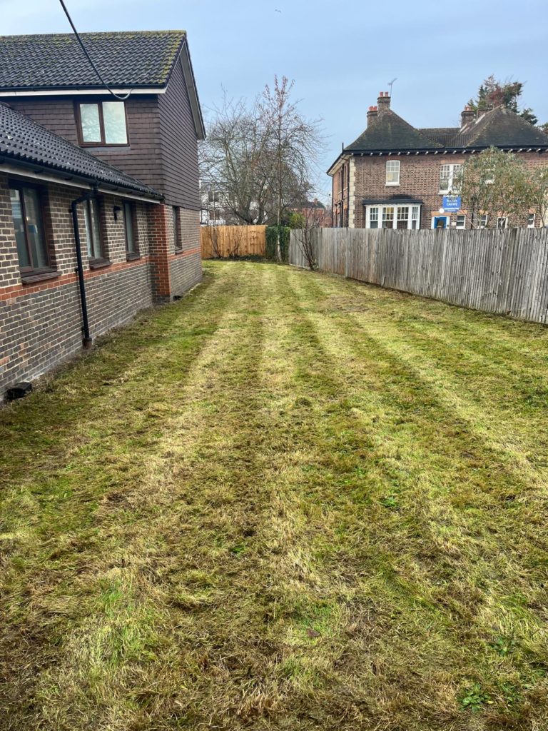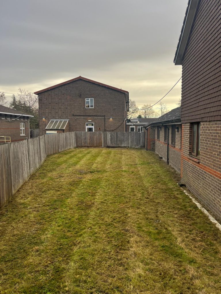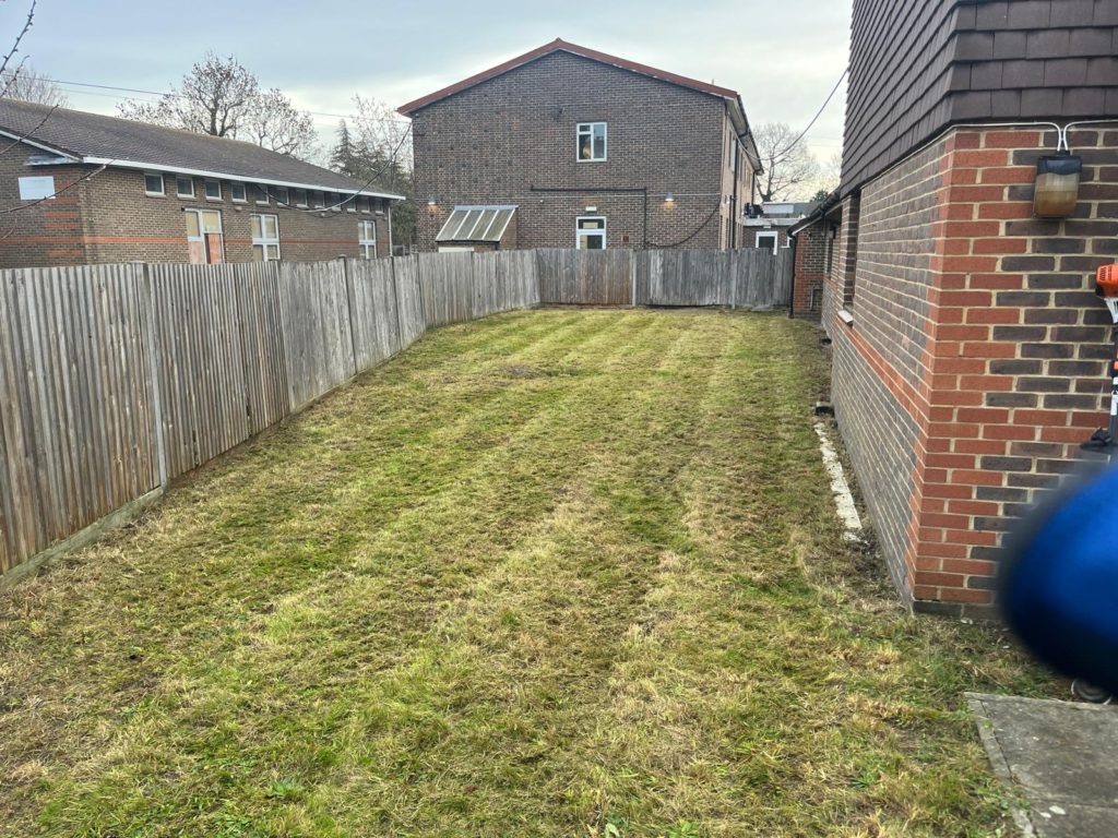 Remove high level grass using lawnmower & strimmer to entire garden area & side alley.